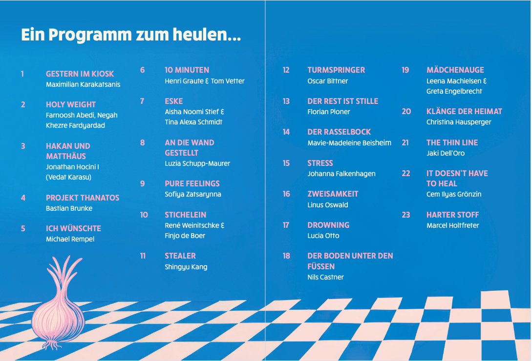 Filmschaffende aus aller Welt von Südkorea bis in die USA haben sich zum Thema „Heul doch“ intensiv mit Emotionen, Verletzlichkeit und der Kraft der Gefühle auseinandergesetzt. Aus insgesamt 110 Einsendungen wählte die Jury 23 Kurzfilme aus, die am 28. November im Rahmen eines unterhaltsamen Kurzfilmabends präsentiert werden. Dann werden große Gefühle auf der Leinwand gezeigt.